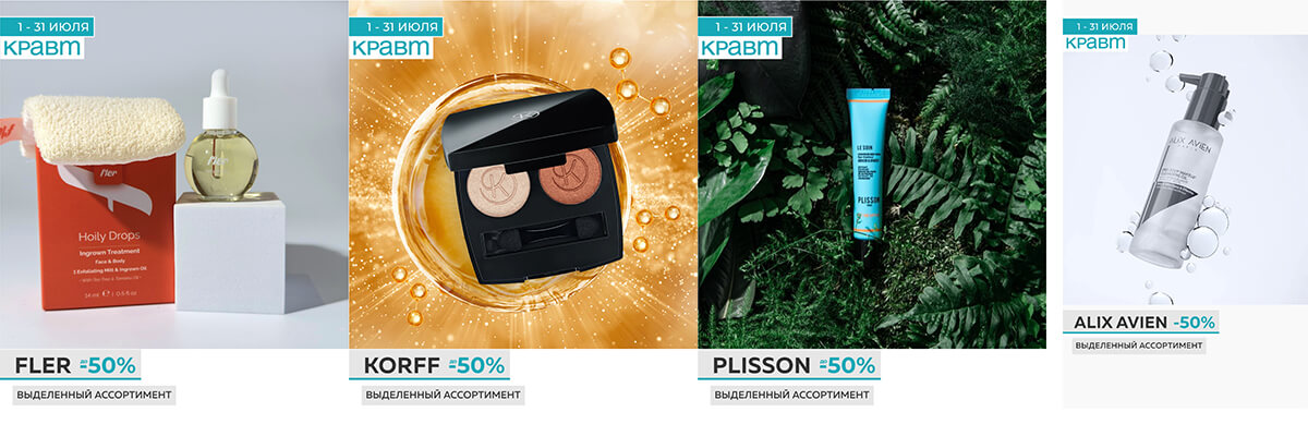 В июле КРАВТ дарит жаркие скидки до 50% на популярные бренды косметики и парфюмерии! Не упустите возможность пополнить свою коллекцию любимыми средствами по самым выгодным ценам!